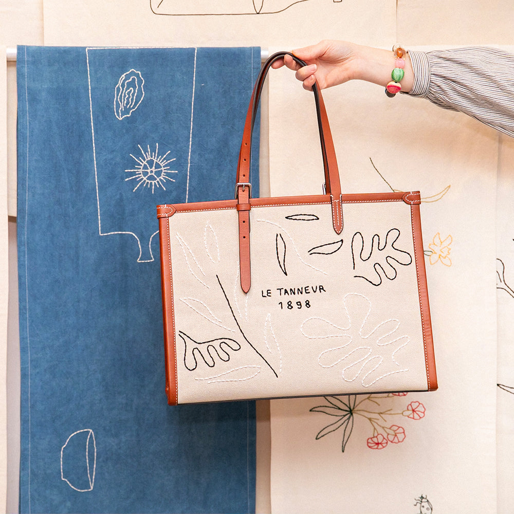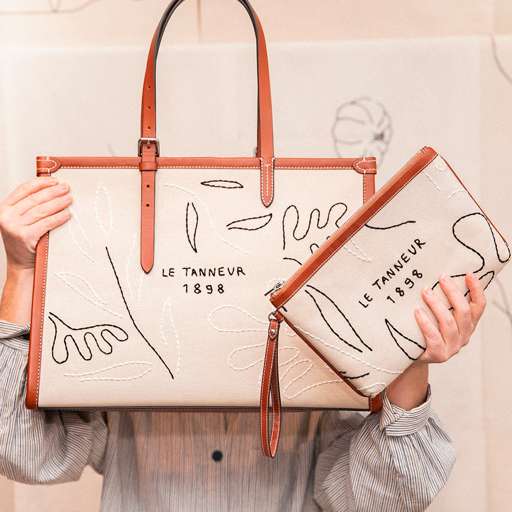 After the success of our first collaboration, a series of tablecloths inspired by the Mediterranean, the Marseille-based artist-designer is now showing us the full extent of her talent with two pieces in canvas and leather: a 125 tote bag and a clutch bag, two embroidered pieces combining summer mellowness and beautiful materials.