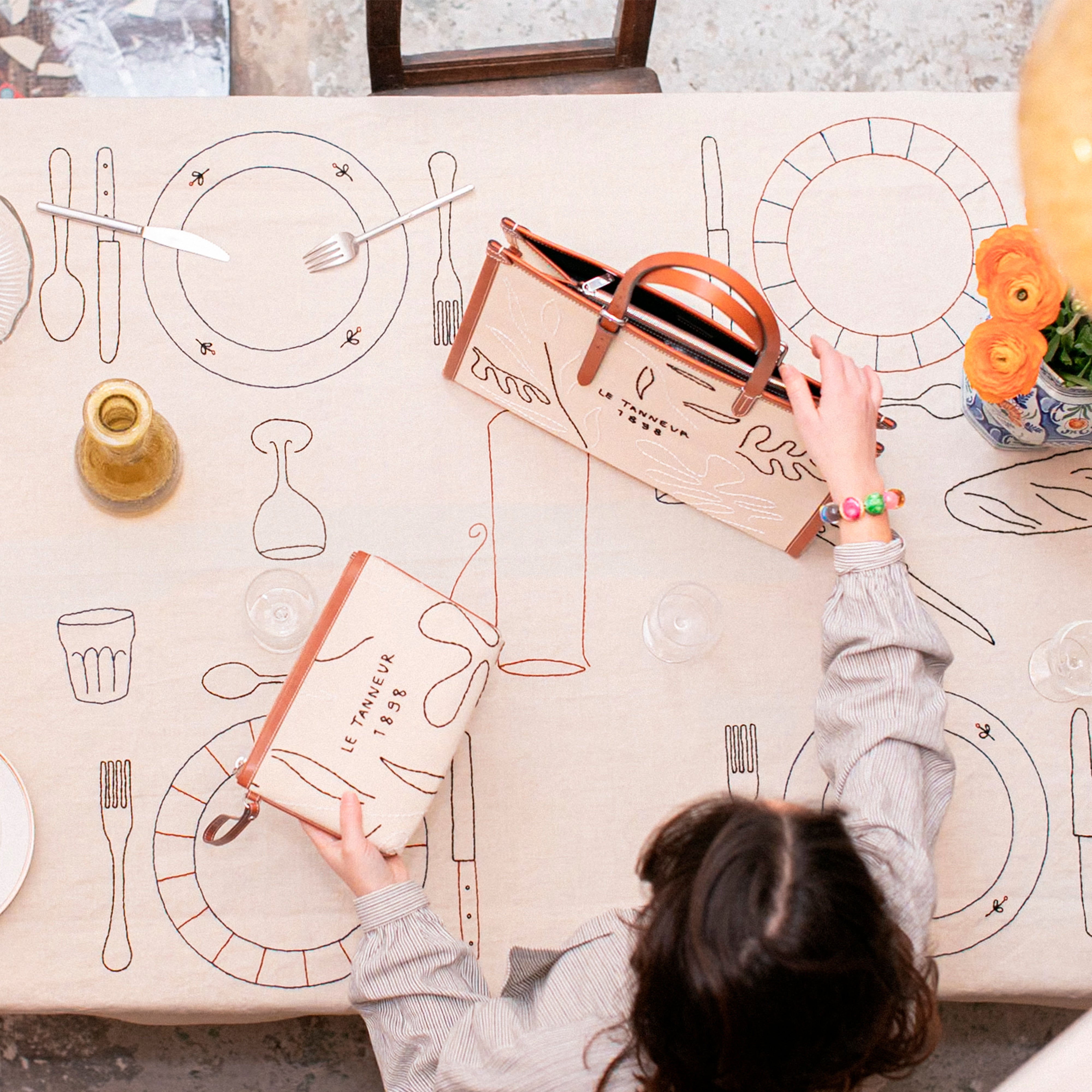 I really like the Le Tanneur coat of arms, which is somewhat subtle and repeats the logo in a different way. Here it becomes an illustration, a really graphic element. It's also on the clutch bag. It's the same type of embroidery as my tablecloths, so it's really an extension of my other work.