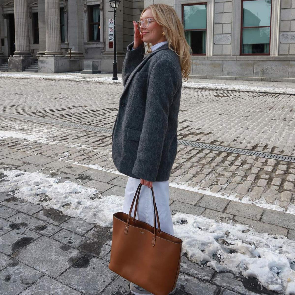 Large, zipped tote in reversible, pebbled leather with removable pouch. Interior in resinous leather. Worn on the shoulder. Can hold a 16" laptop.