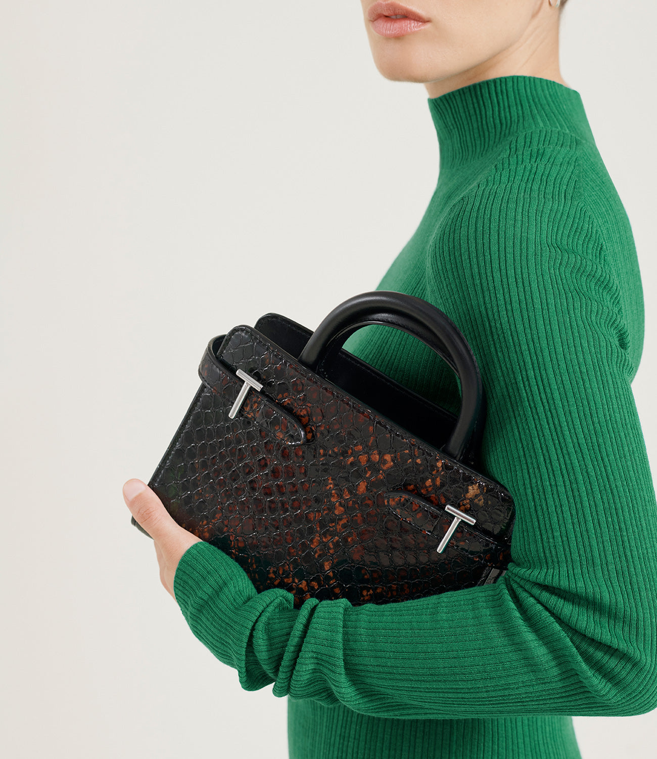 The embossed python effect leather is fullgrain cowhide with digital printing, giving the appearance of python and a glossy varnished finish. Each model features a unique texture blending seasonal colors.
