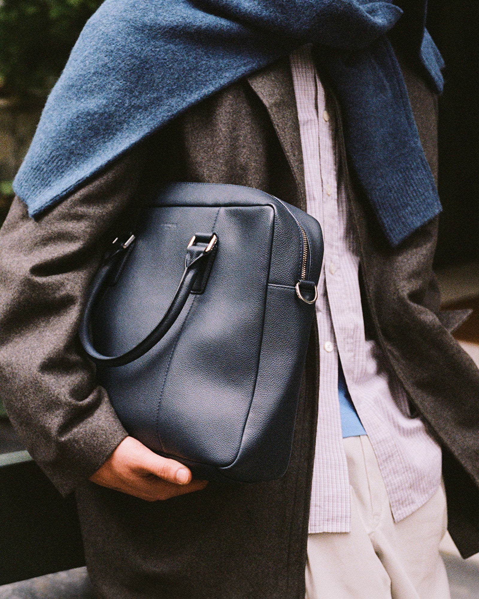 The Marceau line comes in two complementary formats: a grained leather briefcase, the standout piece in the office leather goods category, and a more compact, contemporary camera bag. Both designs feature a removable and adjustable strap, offering the option to wear by hand or crossbody—a timeless Le Tanneur signature.